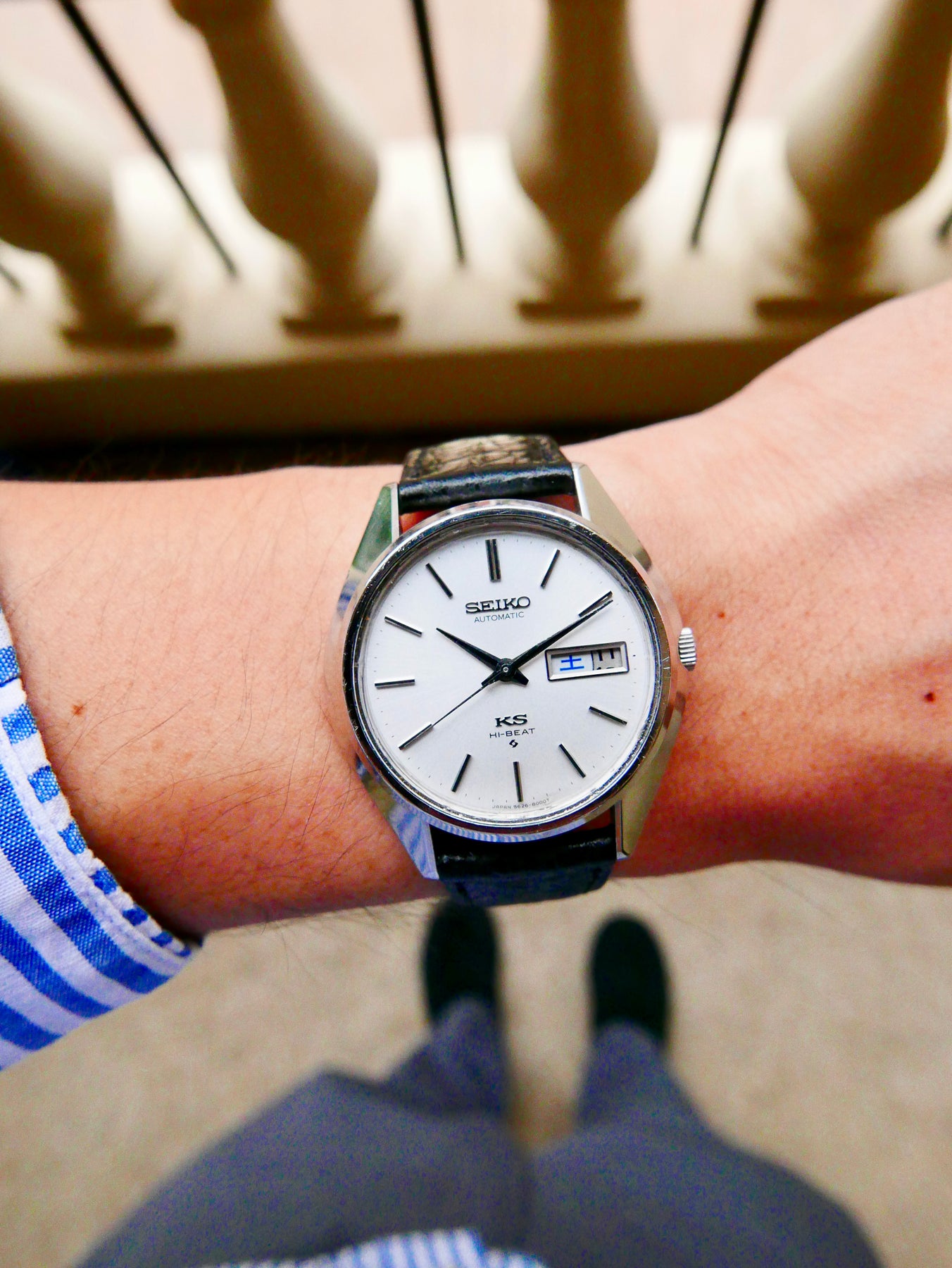 This particular King Seiko 5625-8000 stands out with a sharp case and original Seiko Box and even the paper cover of the box and original Seiko leather straps:
