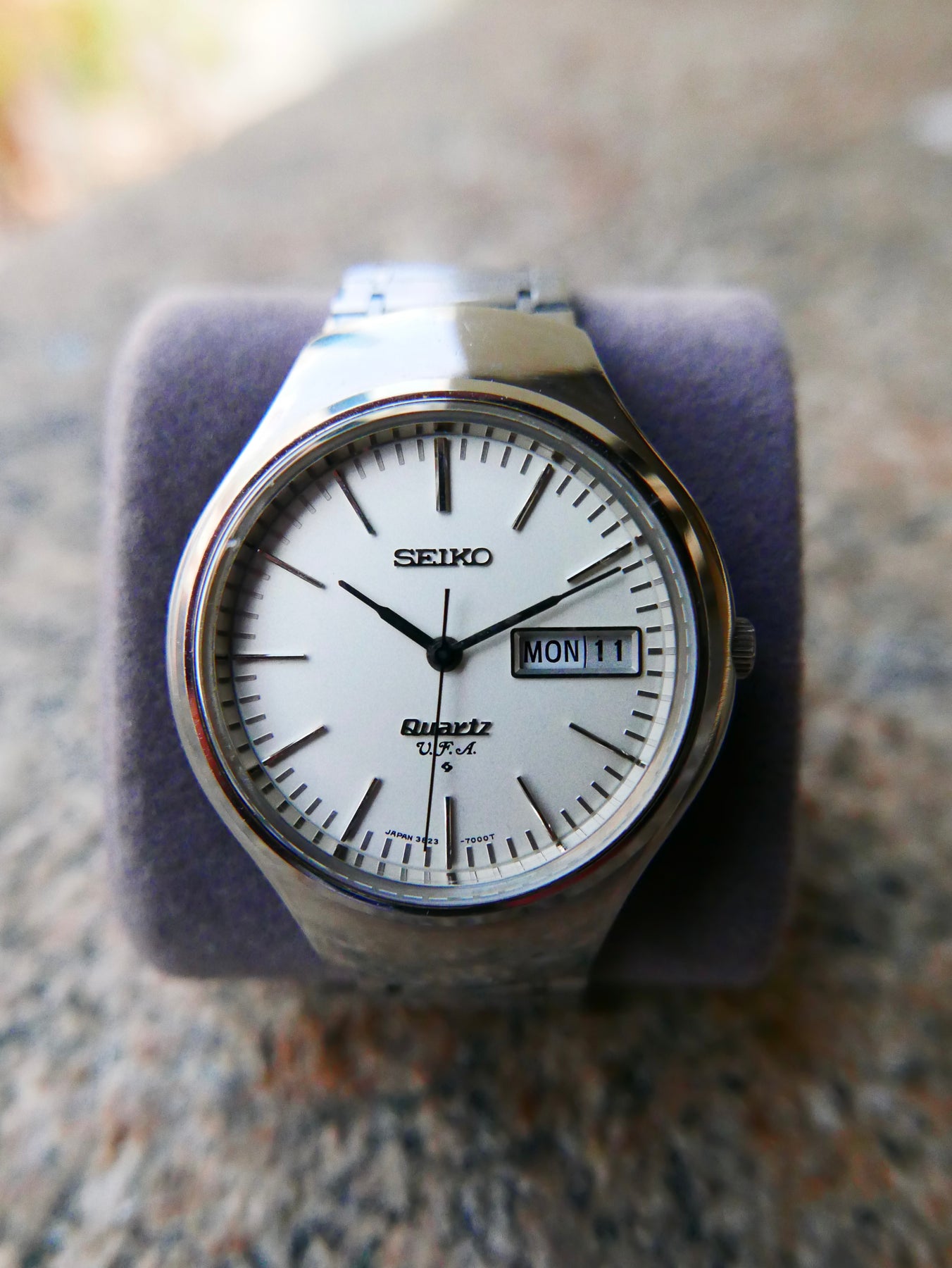 At its core lies the Caliber 3823A, a 7-jewel quartz movement that revolutionized reliability, needing only occasional battery changes for precise timekeeping. This VFA designation signified Seiko's highest tier of quartz calibers, with individual adjustments ensuring chronometer-level performance. Emerging during the 1970s Quartz Crisis, the 3823-7000 bridged mechanical traditions and modern innovation, featuring a quick-set day-date complication and robust design that influenced future Seiko quartz models. Its limited production and futuristic styling make it a rare find among vintage Seiko enthusiasts today.