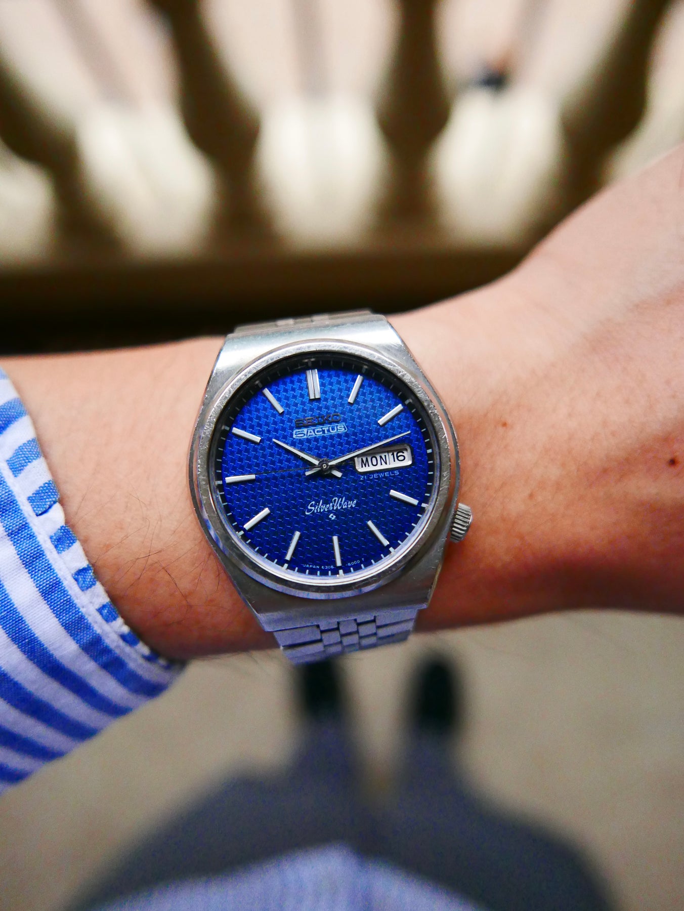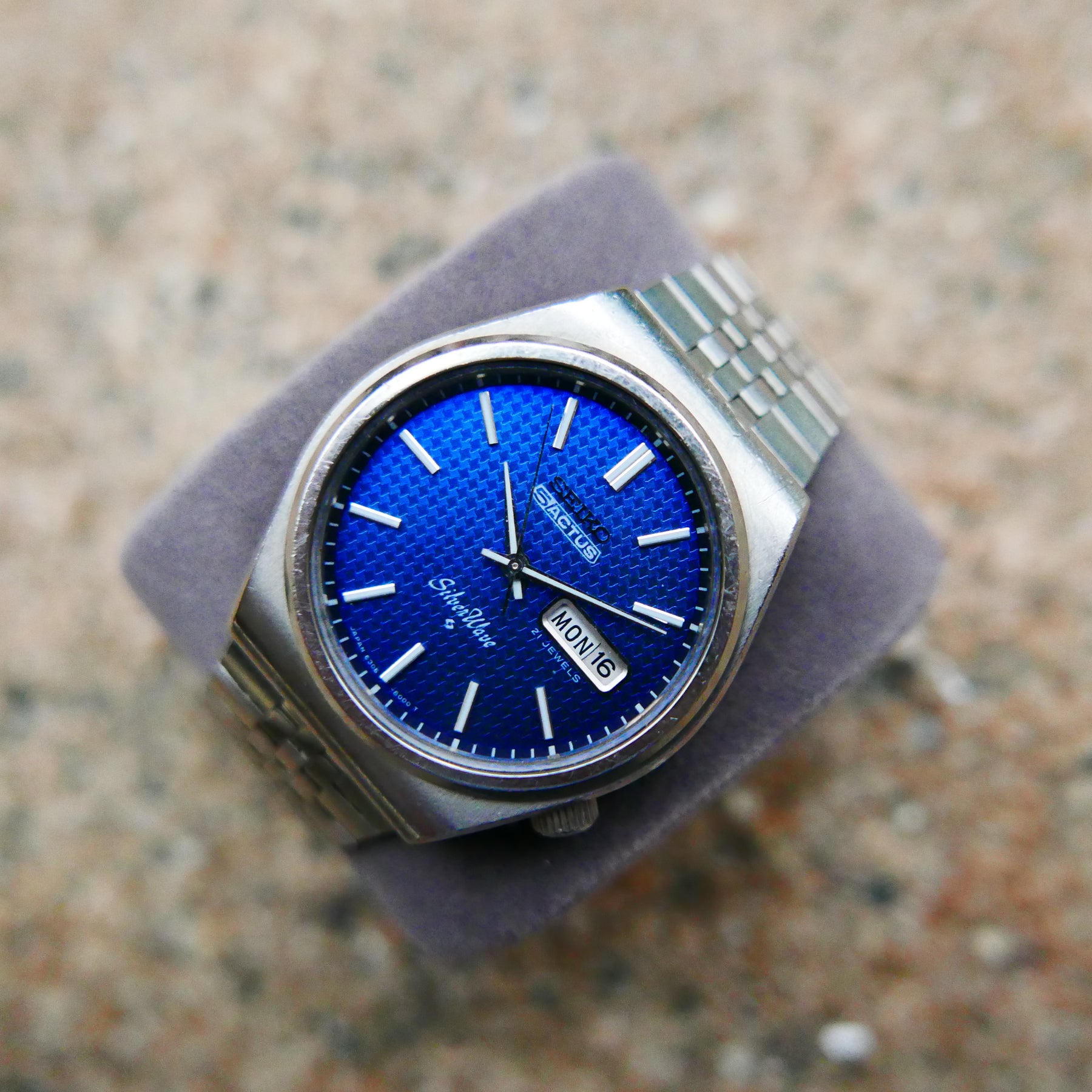 This one is special: Seiko Silverwave 6306-8000 reference, produced May 1976, with the electric blue weave textured dial and the Silverwave logo above 6 o’clock. Light plays across that dial like crazy – deep navy one second, bright cobalt the next. It’s legitimately one of the coolest vintage Seiko dials ever made, full stop.