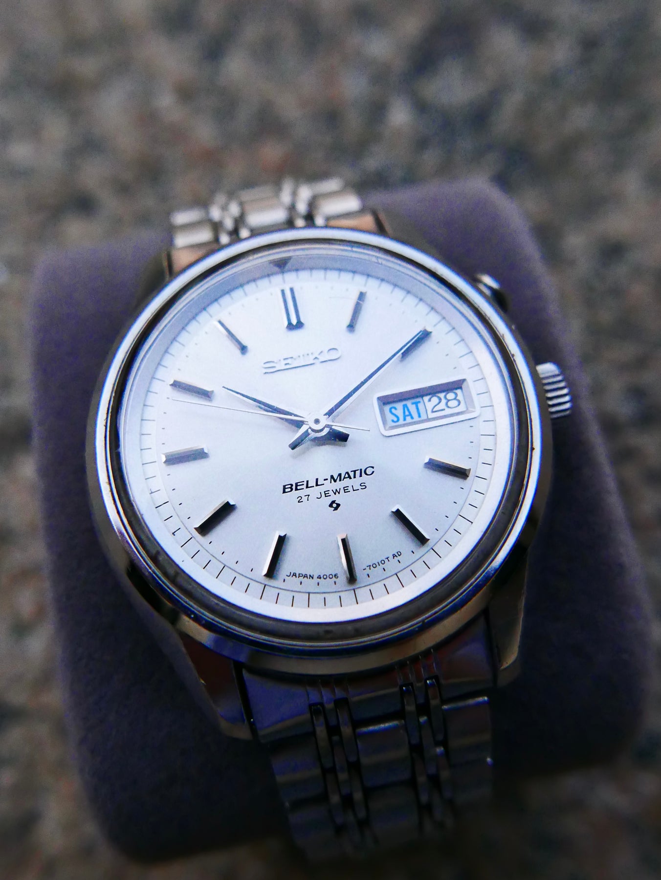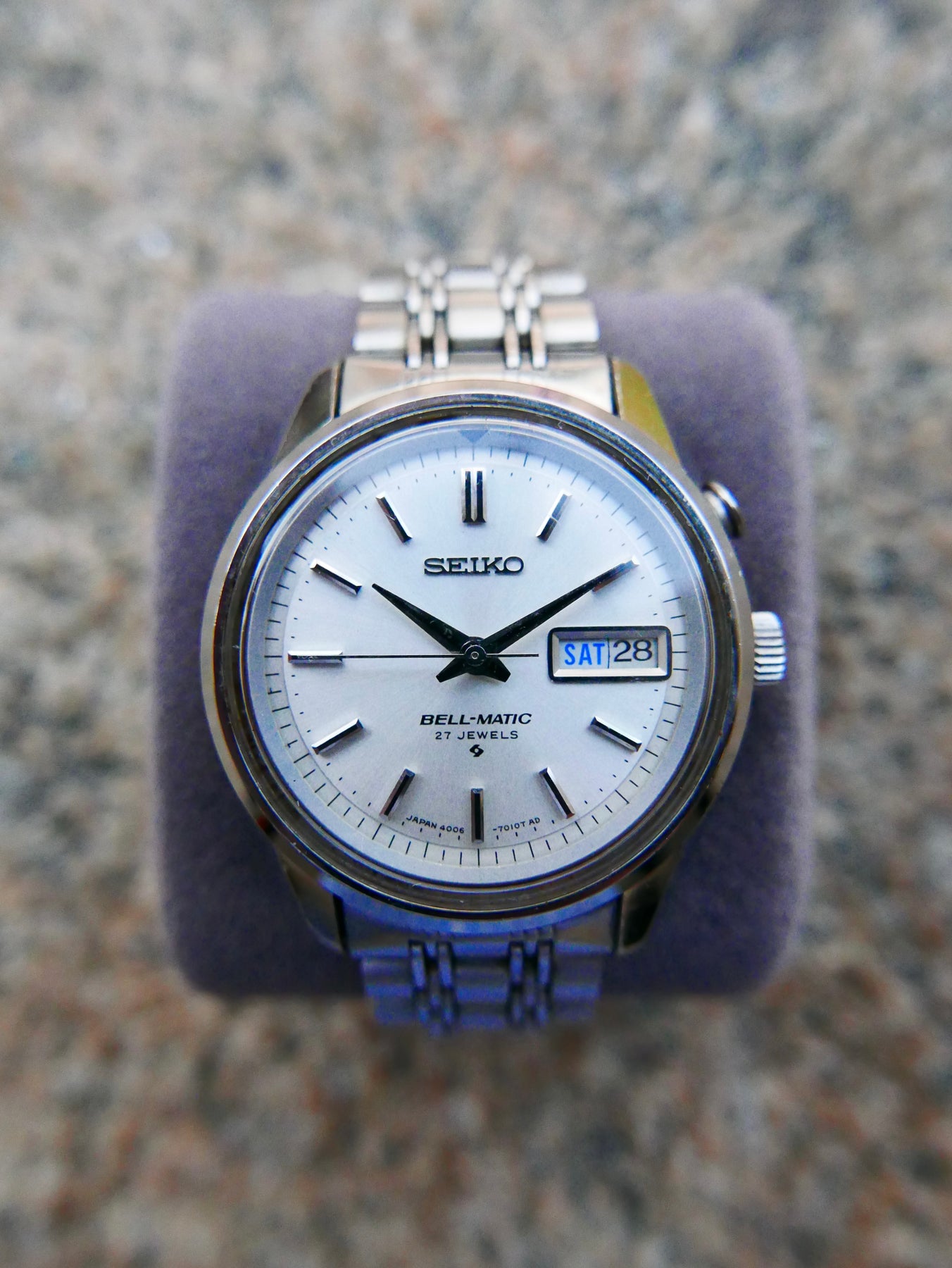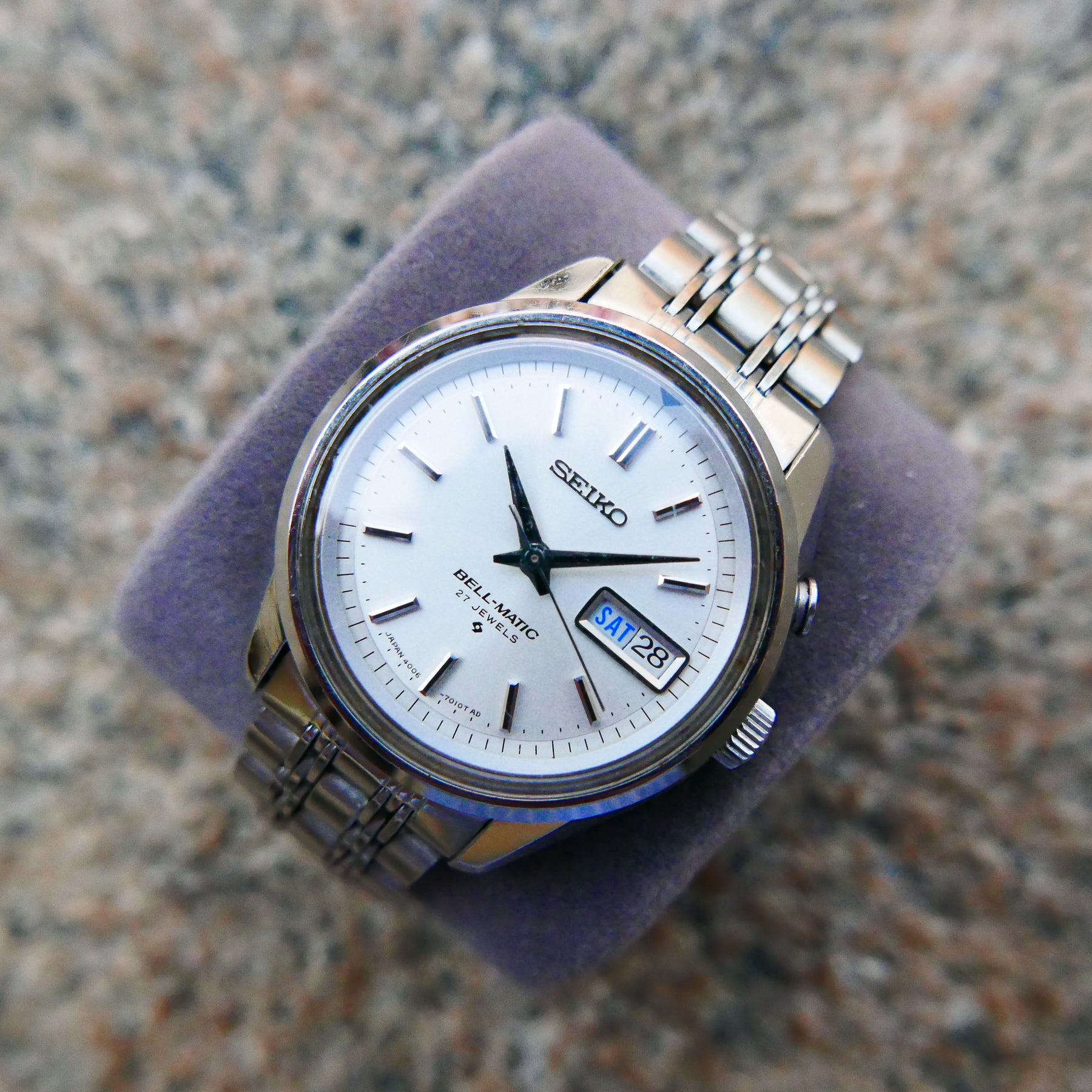 The Seiko Bell-Matic stands out in the history of Vintage Seiko watches as the first wristwatch to feature a rotor automatic alarm movement. This pioneering design makes it the only Japanese alarm watch with purely Japanese origins. Among its movements, the rarer 4005 caliber—produced exclusively in 1968 and 1969—shares similarities with the more prevalent 4006 caliber. The primary distinction lies in their calendar functions: the 4005 offers a date-only display, while the 4006 includes both day and date indicators. Collectors often refer to these as the 400x series.