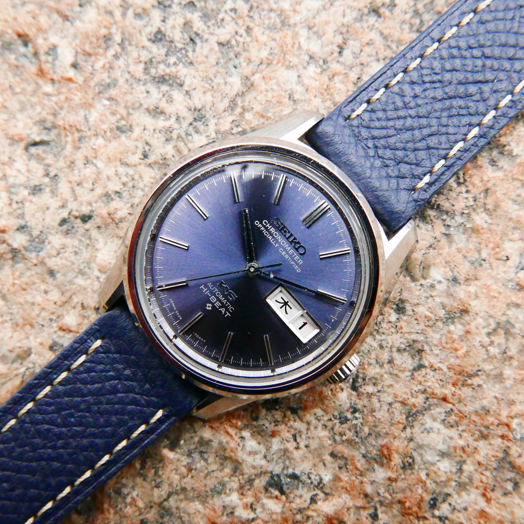 This reference is extremely rare and one of the most sort after King Seiko reference. The signature King Seiko Chronometer 5626-7040 in Blue Dial, housing a Hi-Beat Chronometer Grade movement that hums along at an impressive 28,800bph. Seiko constructed this unique movement leveraging all the knowledge and technology gleaned from building the chronometer-rated movements, while ensuring the durability of the movement.
