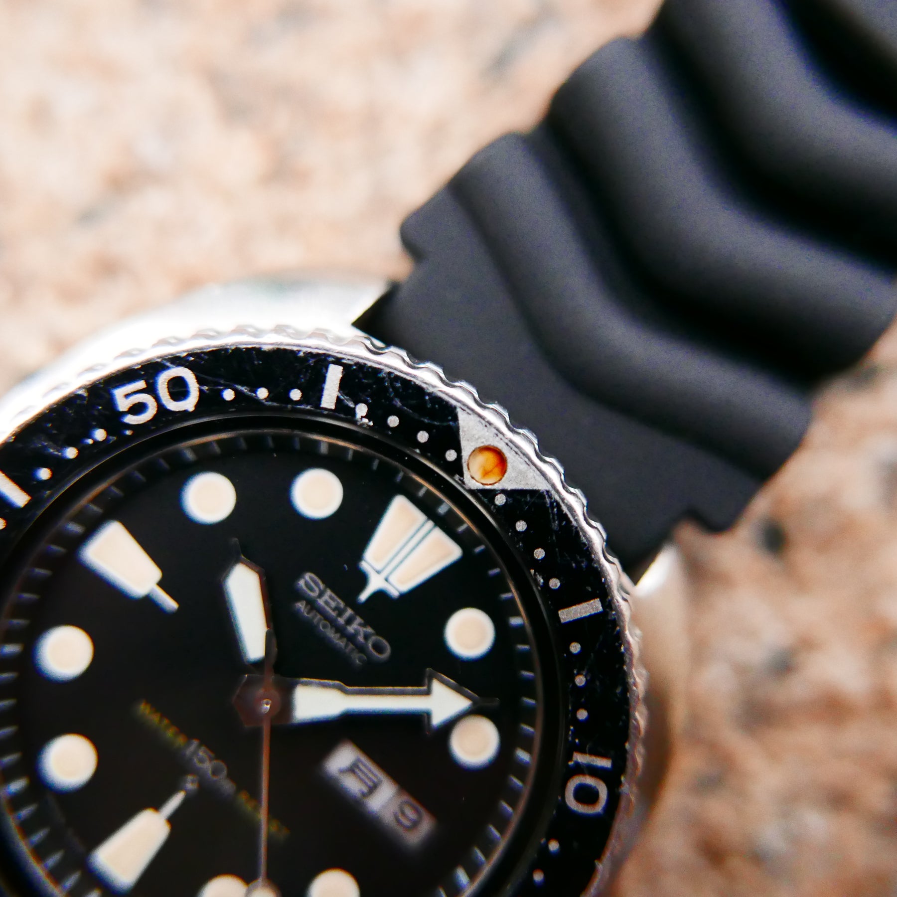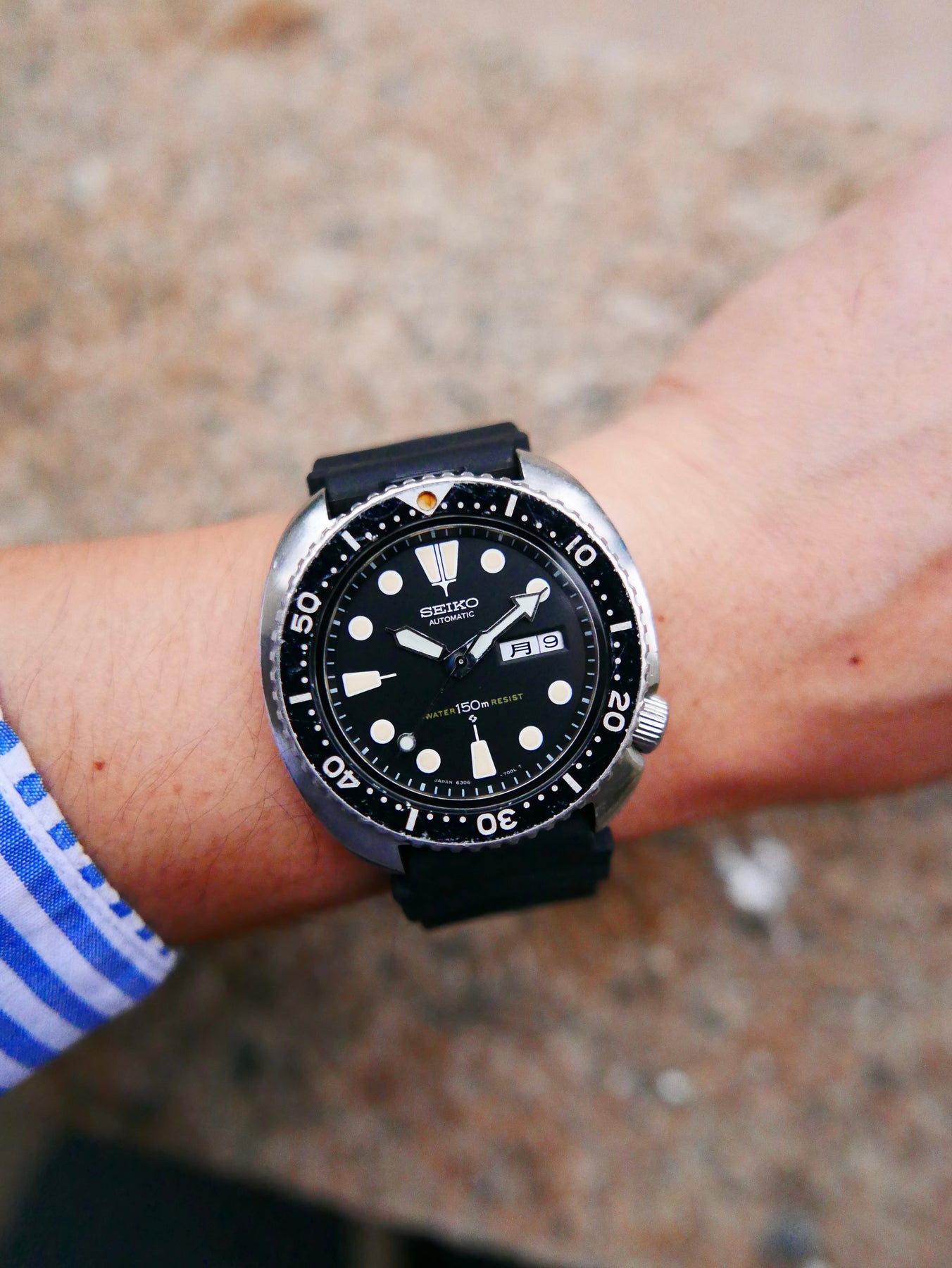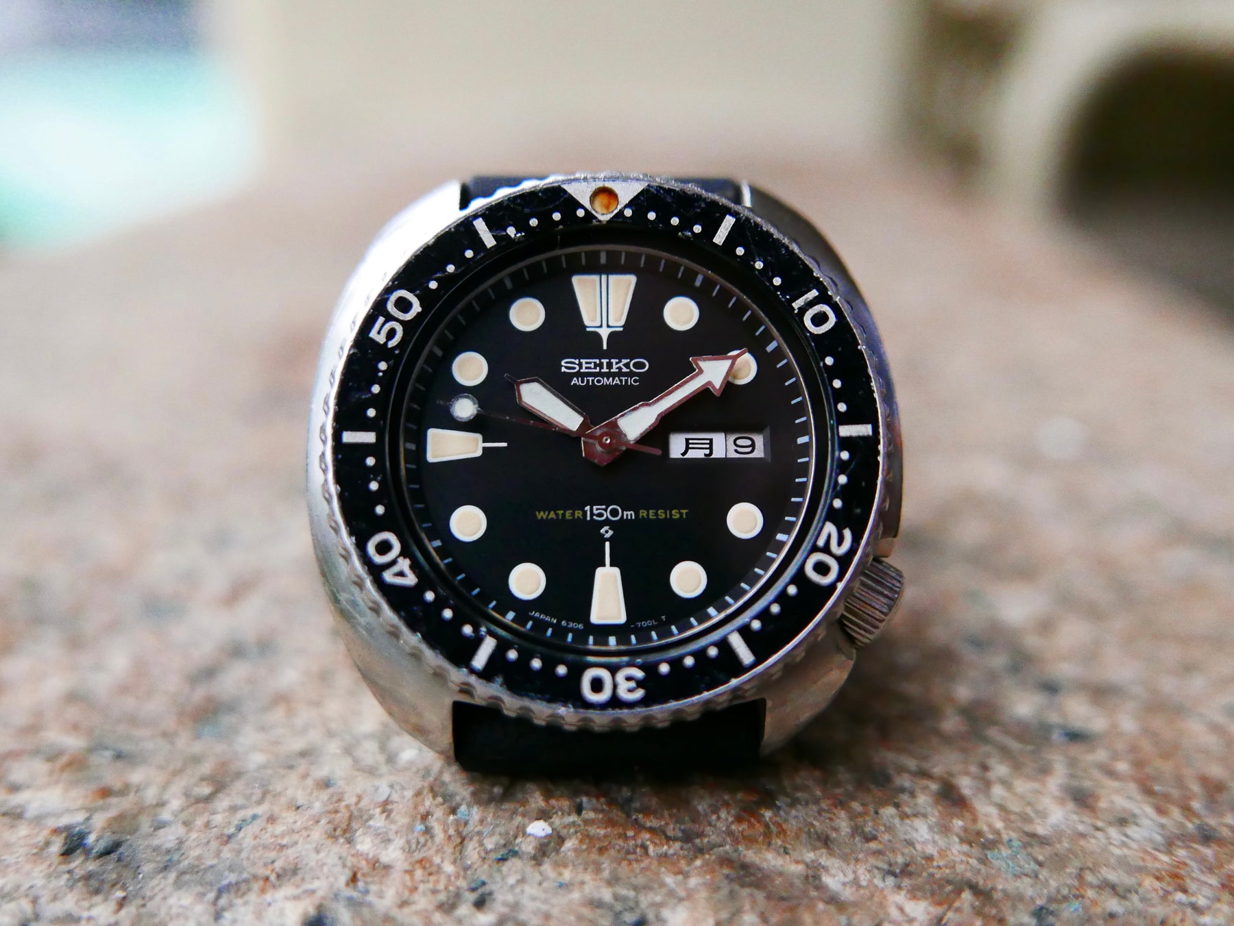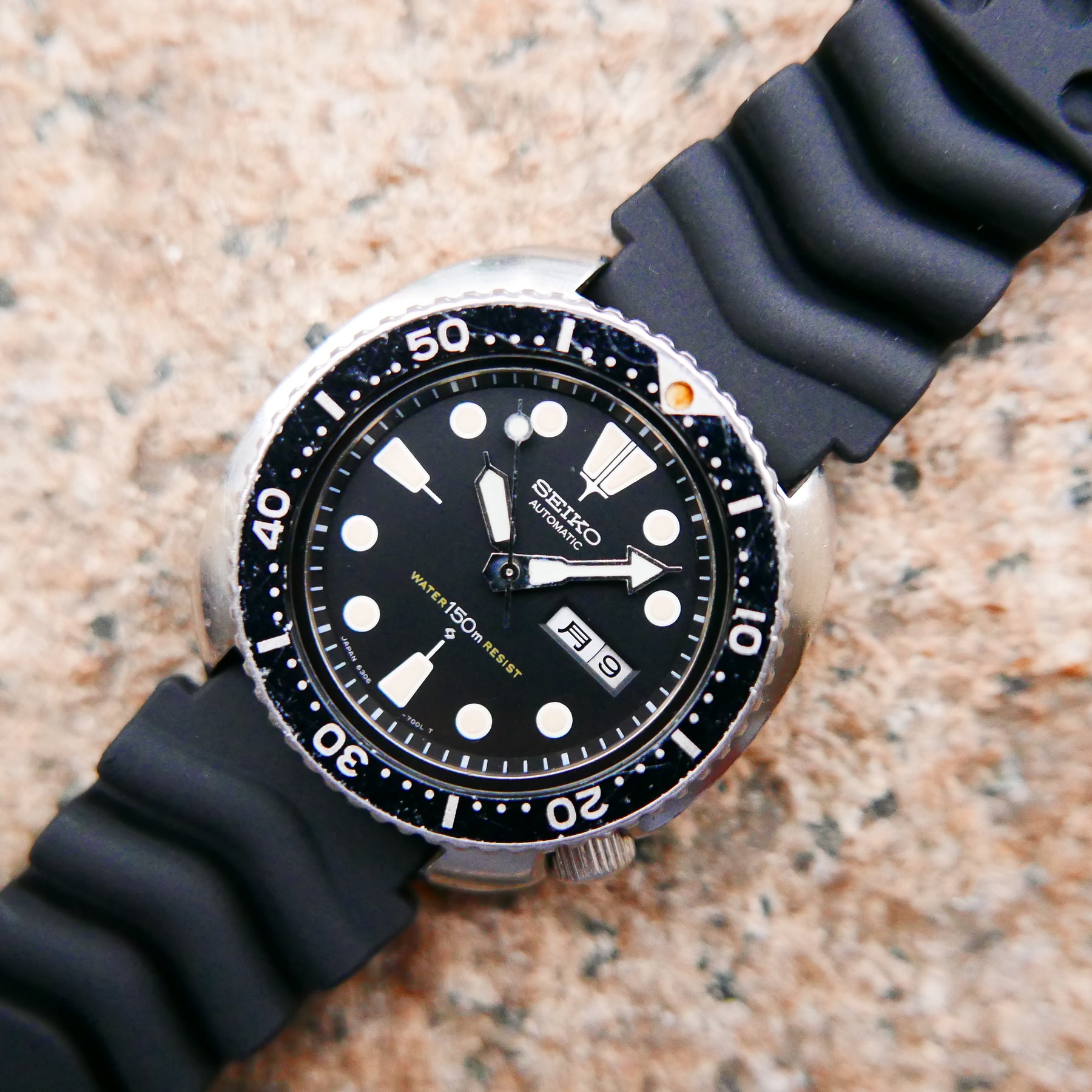 The Seiko 6306, produced from 1976-1982, is more available than rarities like the 6105 but remains a staple for its iconic shape and reliability. Compared to its export counterpart, the 6309, the 6306 is the JDM line with a Kanji day wheel, while the 6309 features Arabic or English wheels for international markets. This makes the 6306 rarer and more sought after, as collectors find the Kanji day wheel particularly attractive for its cultural authenticity and exclusivity to the Japan market. I recently reacquired this one after selling my previous example—glad to have it back, as it embodies accessible '70s grit. I love the yellow patina on the Turtle lume, more even and honeyed without black spots, unlike earlier greenish hues. Collectors, beware of fake dials from Southeast Asia: Authentic ones have a sloped date window cutout and faded red "Water Resist" text from oxidation; fakes show straight cuts and bright red. This example captures that warm glow and raw charm, making it a thrilling addition for the shop and a piece with soul for everyday wear.
